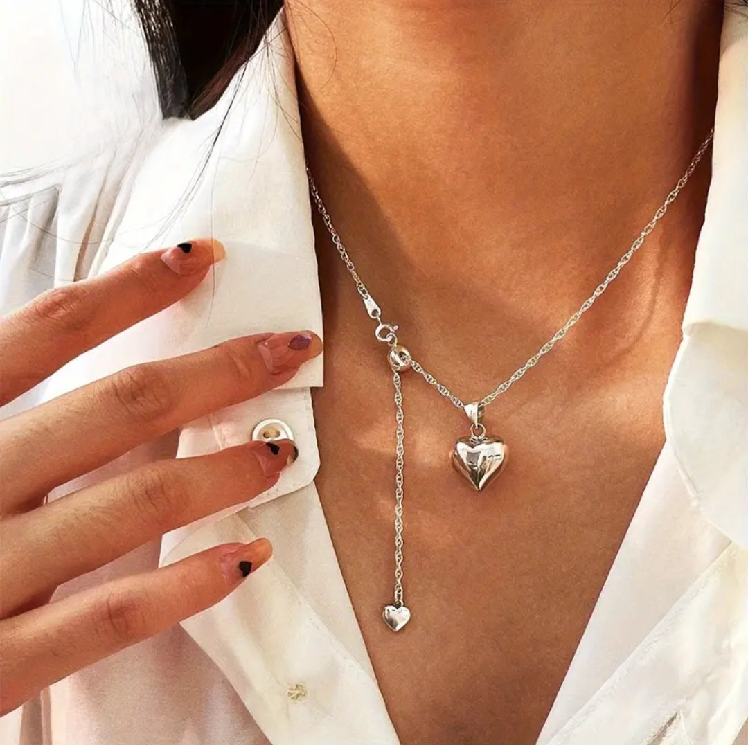 Ova moderna, ali istovremeno bezvremenska ogrlica odlikuje se pažljivo izrađenim duplim privjescima u obliku srca – jednim masivnijim srcem koje se nalazi na glavnom lancu, i manjim koje visi s dodatnog, tanjeg lanca, elegantno padajući niz dekolte.
